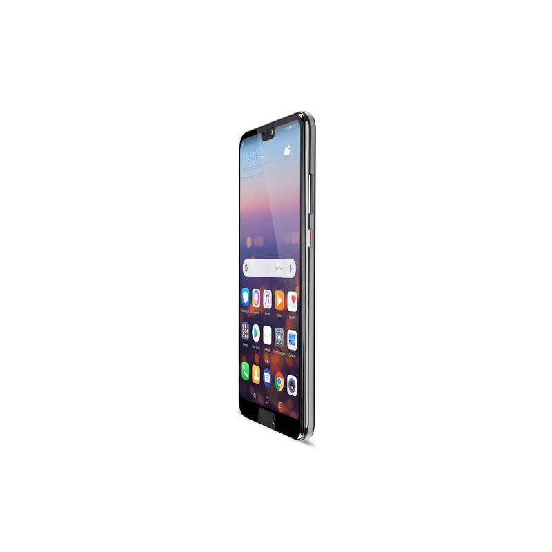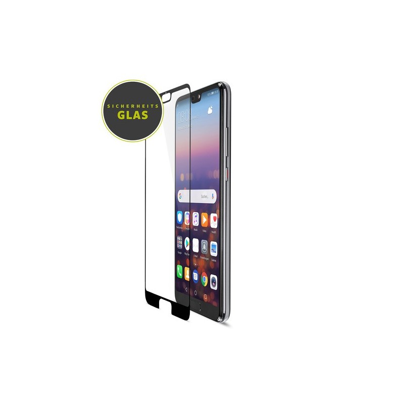 Película de protecção em vidro para o Huawei P20, com arestas arredondadas e bordos de cor preta, cobre o ecrã até às extremidades dos bordos.