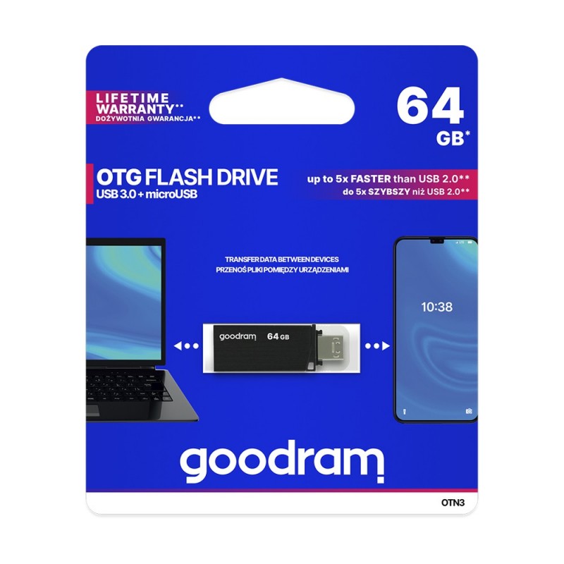 A Pen Drive GoodRam 64Gb OTN3 USB 3.0 + Micro Usbl pode ser usado para armazenamento externo com diferentes dispositivos móveis. Esta pequena unidade flash está equipada com o USB 3.0, de um lado, e o microUSB OTG (On-The-Go), do outro. A função OTG USB permite transferir dados entre um PC tradicional e dispositivos móveis, como smartphones ou tablets. No entanto, o importante é que o dispositivo suporta a função OTG. A forma em miniatura do OTN3 permite conectá-lo a chaves, ou levar no bolso ou na carteira facilitando a partilha de dados.