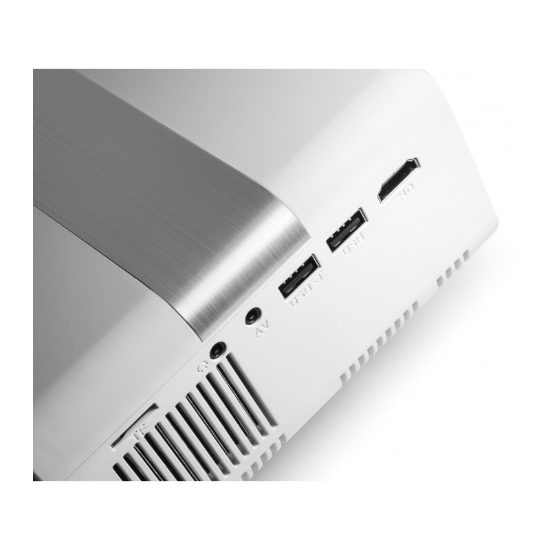Projector com ligação HDMI, VGA e AV, inclui comando remoto. Tem luz 56W/2000 Lumens, distância projeção 0.8-3.8m, ruído máx ventoinha 51 dB, uma porta USB para ligação de um disco externo até 500GB ou pen até 128GB, e uma ranhura MicroSD card máx 128GB.