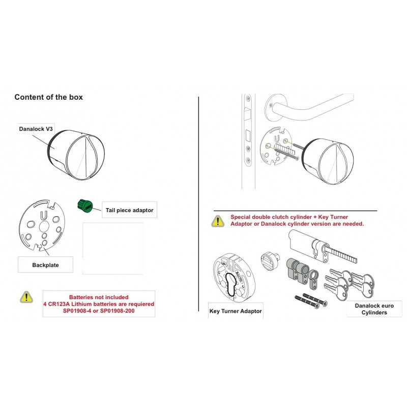 Produto para profissionais e lojas de chaves. Sistema de fechadura controlável por Bluetooth (iOS e Android). Permite fechar/abrir a fechadura da porta remotamente, e atribuir um nº ilimitado de chaves digitais a convidados. Pode-se definir acessos permanentes ou temporários, alarmes, e saber exactamente quem usou a fechadura, e quando. Empacotamento em embalagem simples, incui pilhas, não inclui canhão.