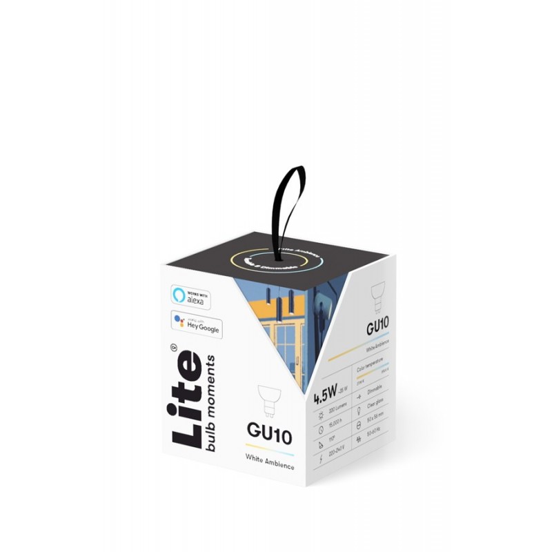 Lâmpada LED inteligente, controlável por Alexa ou Google Assistant. Ficha GU10, A+, 330 lm, 4.5W (equivalente a 5W), ângulo luz 220°, temperatura de cor 2700-6500K, tempo de vida 15.000 hrs, ø50 x 56mm.