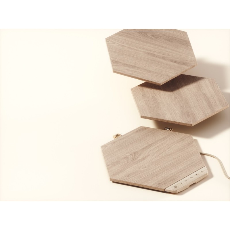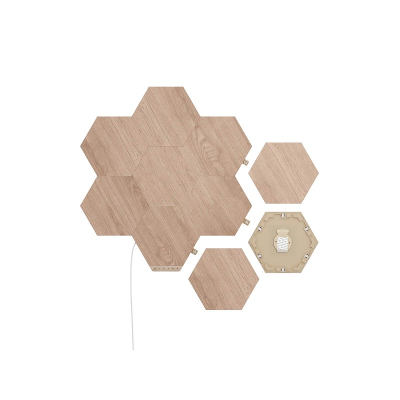 Painéis de luz hexagonais com revestimento em madeira que se conectam entre si até 21 unidades por carregador AC (e 80 unids no total), controláveis por WiFi. Têm um sensor audio para coordenar as luzes com som ambiente e definir cenas e efeitos, são também sensíveis ao toque. Incluem pequenas armações para colocar na traseira, que aderem à parede por autocolante duplo ou aparafusando (parafusos não incluídos). São compatíveis com equipamentos iOS (HomeKit), Android, Amazon Alexa e IFTTT. Ligam a painéis de outras formas da gama Elements.