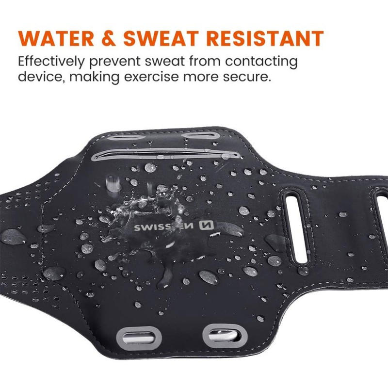 Armband para telemóveis até 6'' com fita velcro ajustável, ranhura para guardar chave, elementos reflectivos, e parte frontal transparente e sensível ao toque.