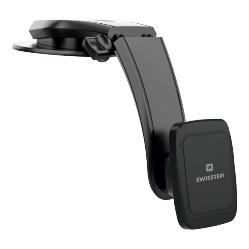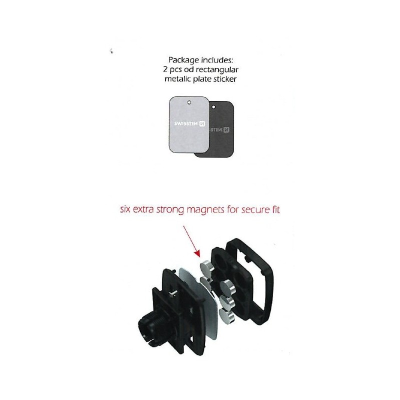 Suporte com ventosa para aderir ao tablier do carro, e armação magnética (tem 6 magnets no seu interior) com capacidade para suspender telemóveis e tablets até 10''. Rotaciona 360°, permitindo colocar o telefone ou tablet na vertical ou horizontal, inclui 2 placas metálicas.