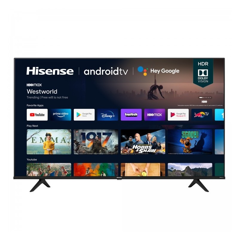 Hisense 43A6BG. Tamanho do ecrã na diagonal: 109,2 cm (43"), Resolução: 3840 x 2160 pixels, Tipo de HD: 4K Ultra HD, Tecnologia de apresentação: LED, Formato do ecrã: Plano, Tipo de retroiluminação LED: Direct-LED. Smart TV. Luminosidade: 200 cd/m², Rácio de contraste (típico): 4000:1, Proporção de imagem nativa: 16:9. Sistema de formato de sinal digital: DVB-C,DVB-S,DVB-S2,DVB-T,DVB-T2. Wi-Fi, Ethernet LAN. Peso do produto: 6,8 kg. Cor do produto: Preto.