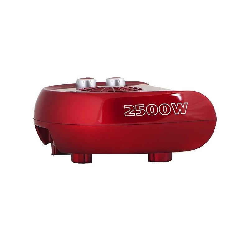 Seletor rotativo de 3 posições: - Modo fun - 2 potências: 1250 - 2500W Calor instantâneo Temperatura ajustável por termóstato Pega para transporte Sistema de proteção contra sobreaquecimento Lus indicadora de funcionamento Potência: 2500W Dimensões (LxAxC): 265x135x270mm Voltagem: 230V ~ 50Hz