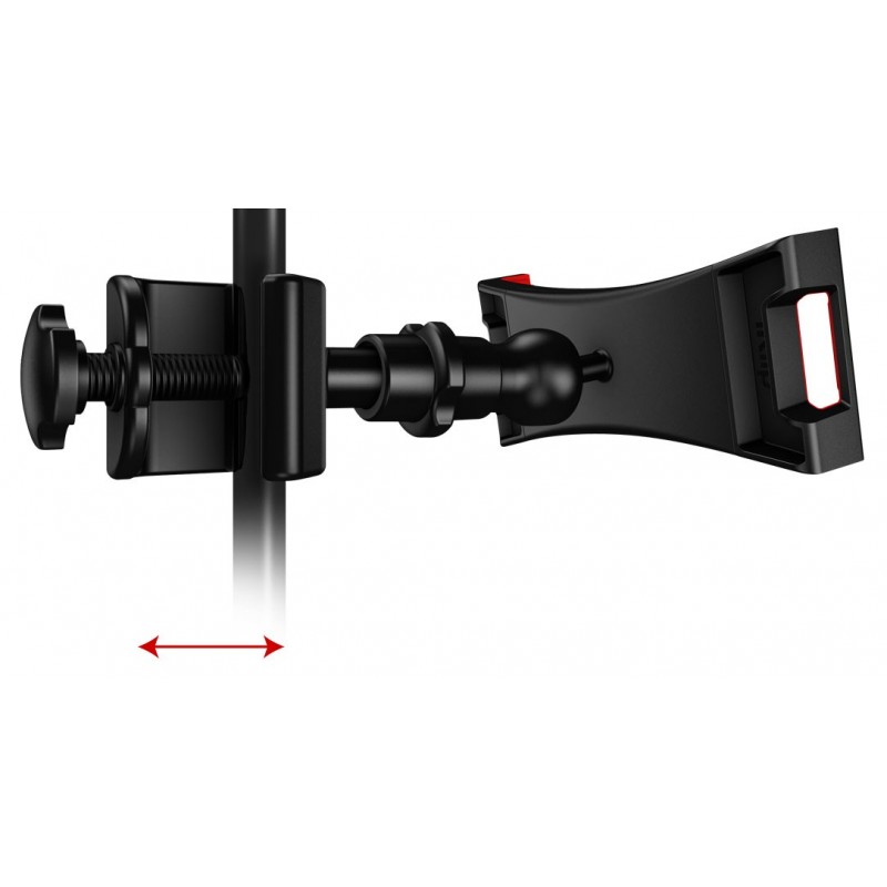Armação com garras expansíveis para tablets de 7 a 12.9'', que encaixa em qualquer bastão de microfone ou similar. As garras têm revestimento interior em borracha para não riscar o tablet, a armação tem um eixo esférico que permite ajustar o ângulo de visão, e colocar o tablet na vertical ou horizontal.