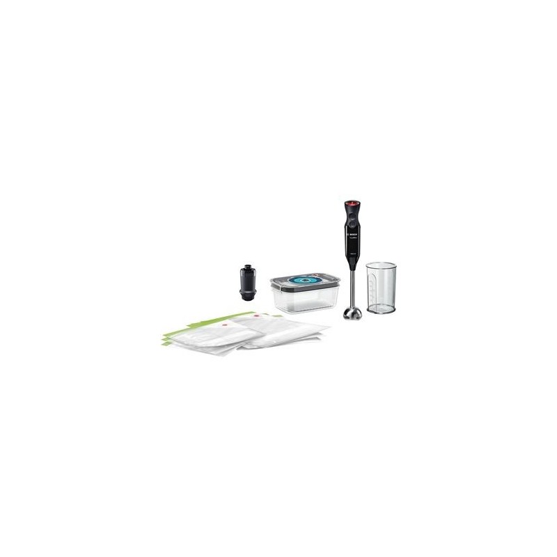 1000 W. Lamina inovadora de 4 cortes QuattroBlade e funçao AntiSplash para resultados perfeitos sem salpicos. Selector de 12 niveis de velocidade, Turbo. Mecanismo Eject-Click patenteado da Bosch. Silenciosa. Ergonomica. Conservaçao de alimentos com sistema de vacuo atraves de acessorios de vacuo incluidos: bomba de vacuo, caixa com tampa (1 l), 3 sacos reutilizaveis de 3,8 l e 3 sacos reutilizaveis de 1,2 l. Sacos de vacuo aptos para cozinha Sous Vide ate 85º C. Inclui: copo misturador (600 ml).