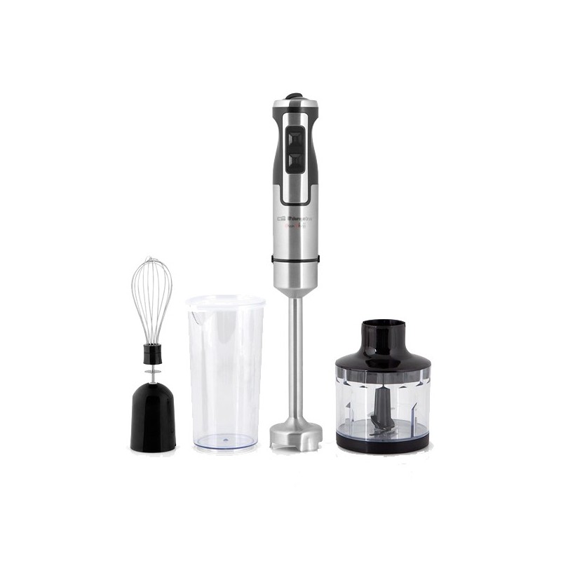 Potência: 1000WMotor DC potente e silenciosoSeletor de velocidade com luz2 botõesFunção turboPega ergonómicaLâmina de aço inoxidávelCopo misturador de 600mlBatedor de aramePicador de 500ml com tampaTensão: 230V - 50Hz